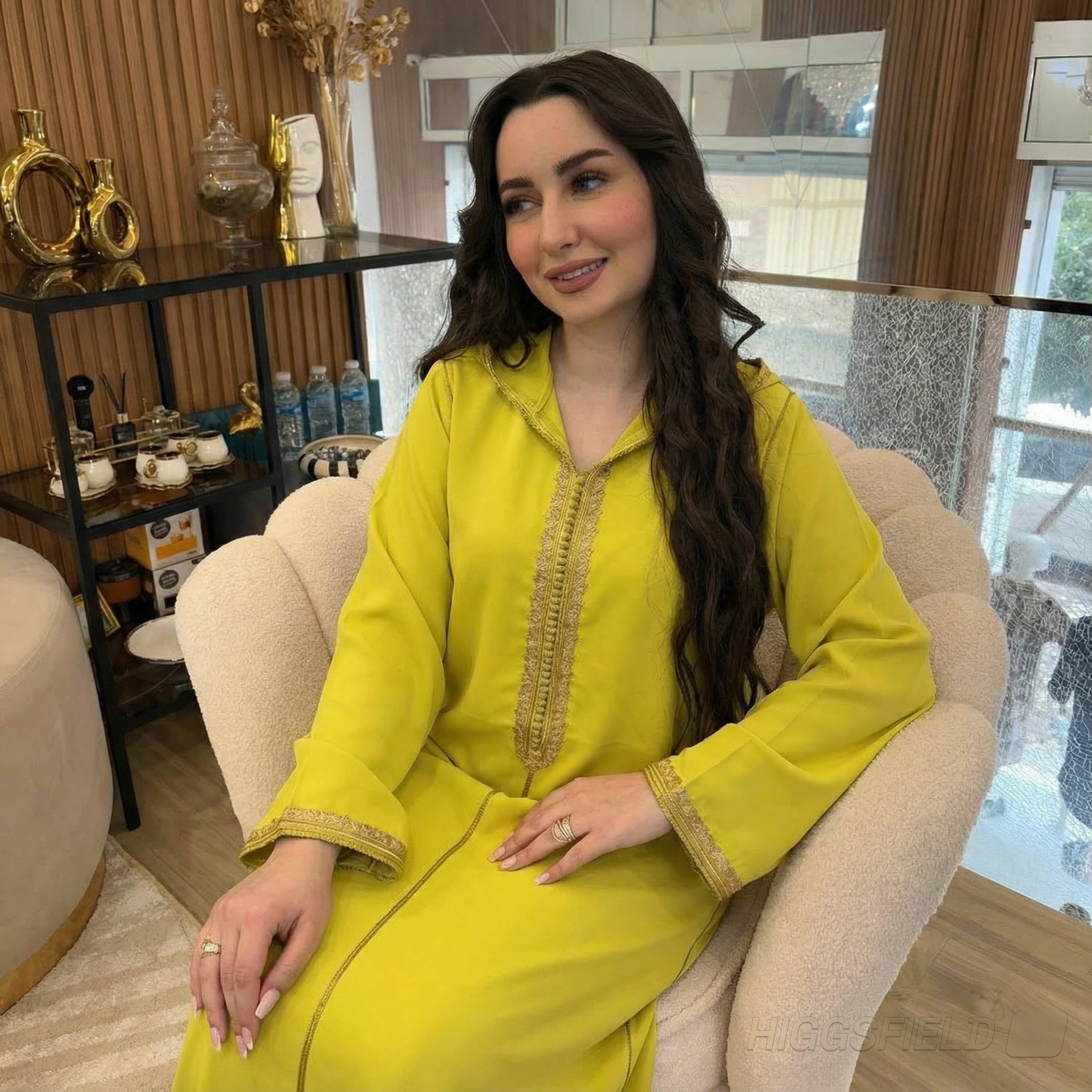 Couture El Mâalem dorée pour un look luxueux et authentique, signature marocaine.