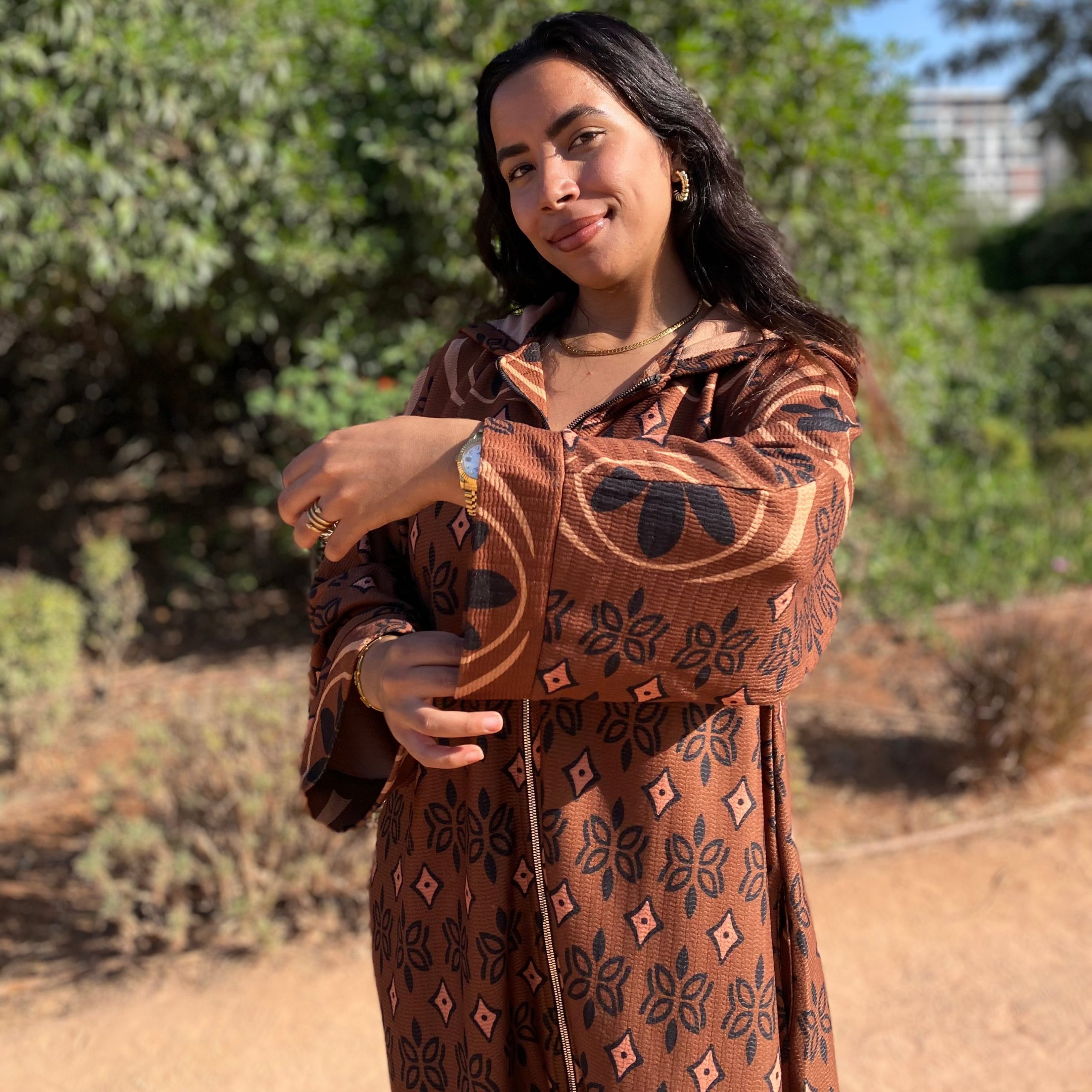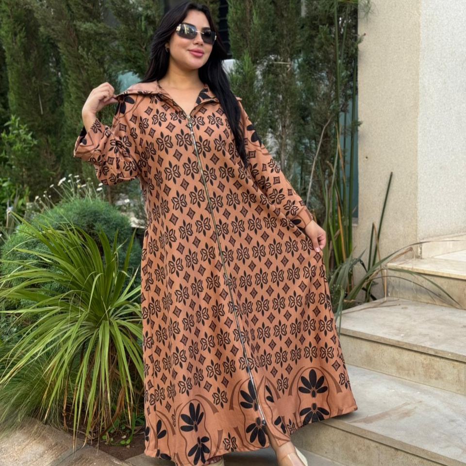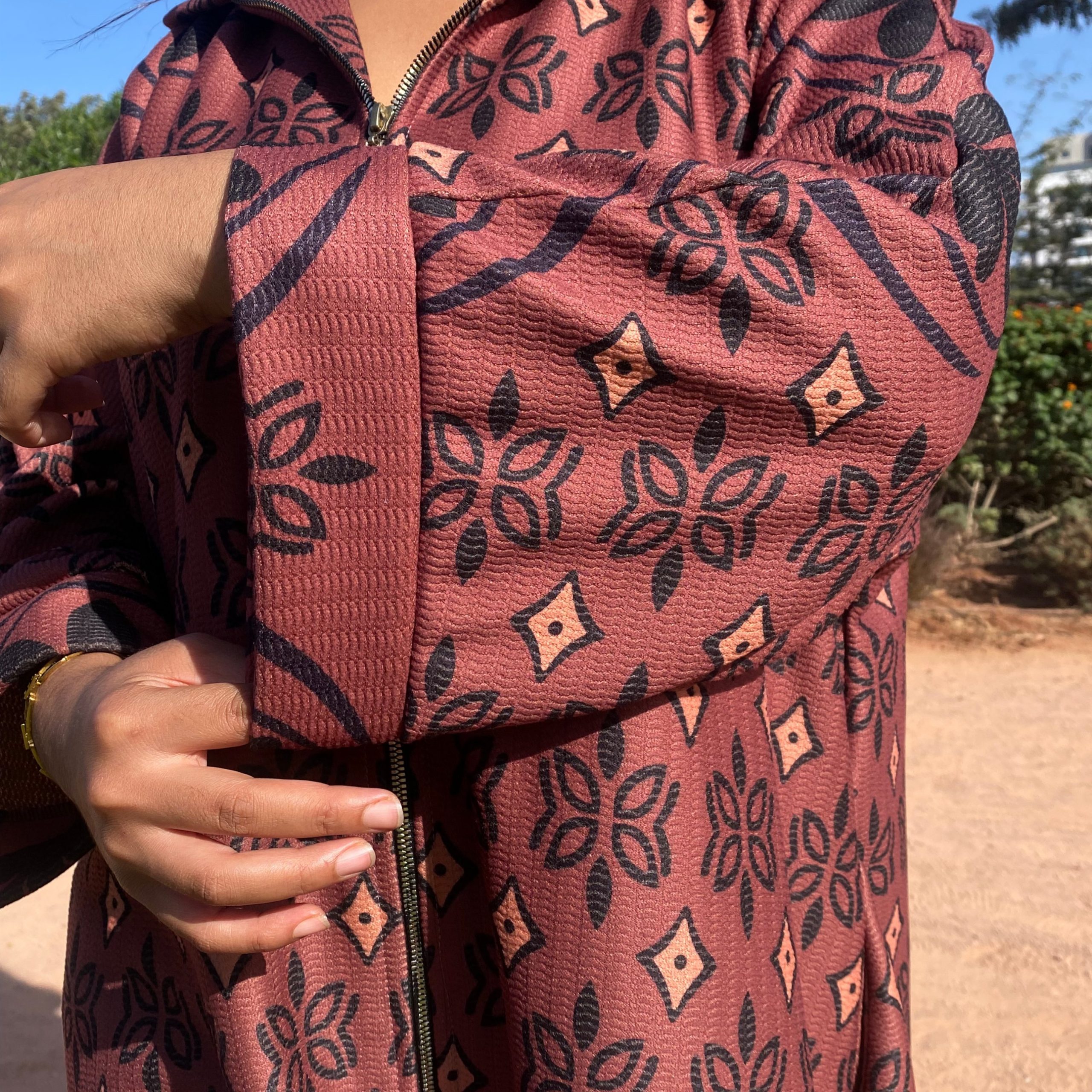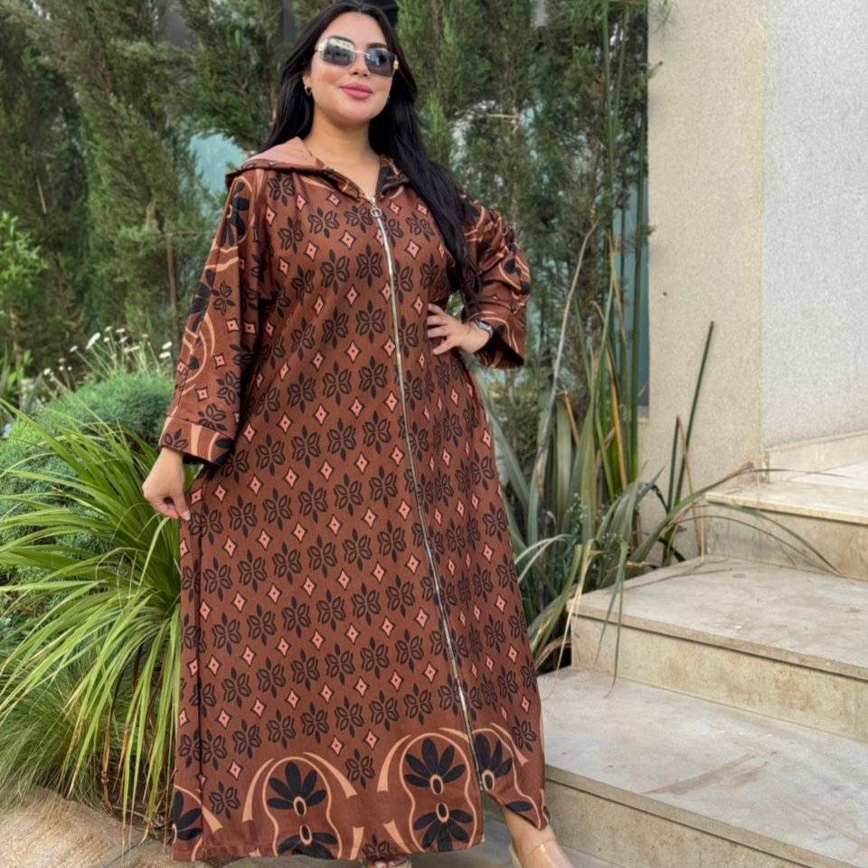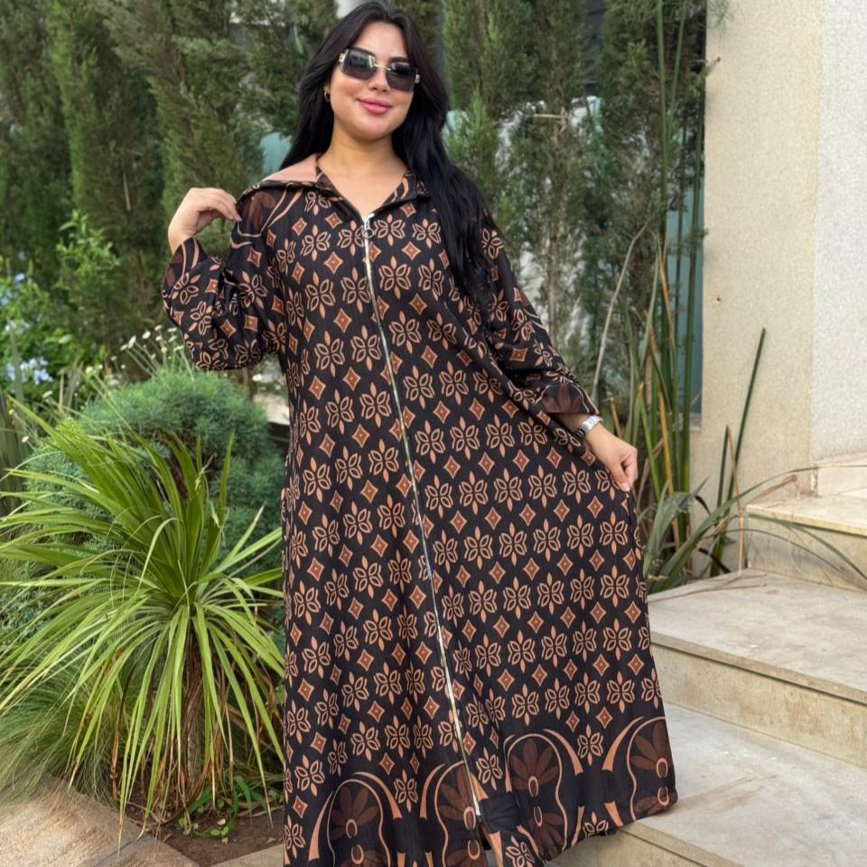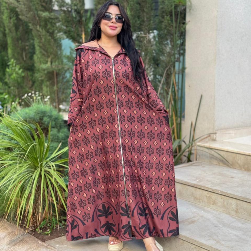 Djellaba moderne en jacquard texturé, sublimée par un motif géométrique raffiné et une fermeture zippée sur le devant pour un style à la fois pratique et élégant. Parfaite pour une allure chic au quotidien.
