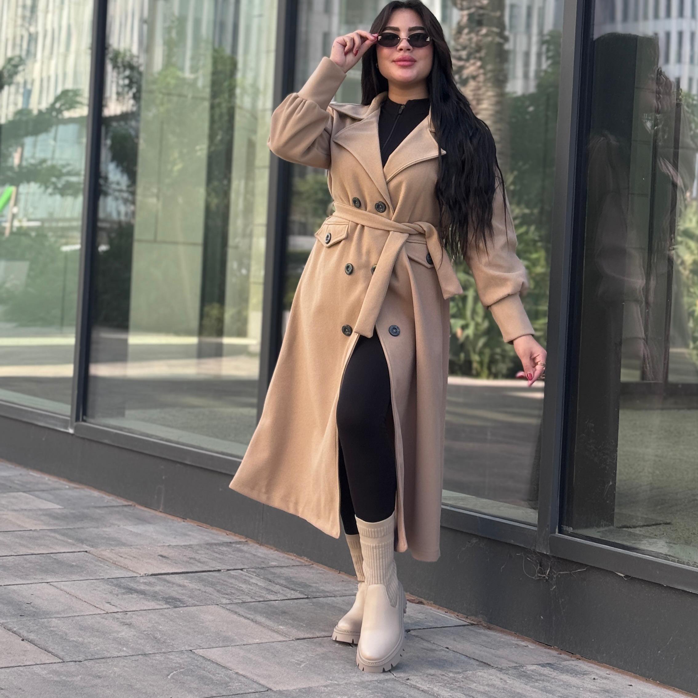 Manteau long en cachemire, doté d’une ceinture ajustable et de boutons décoratifs à l’avant. Coupe raffinée et tissu doux pour une allure chic et féminine.