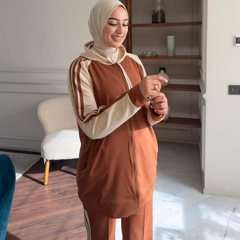 Ensemble de sport moderne et confortable composé d’une veste à capuche et d’un pantalon à bandes, parfait pour un look décontracté et élégant au quotidien.