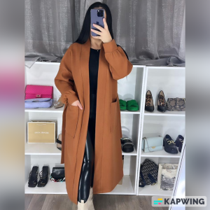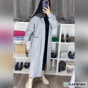 manteau court en tissu cachemire, avec manches en fourrure et ceinture à la taille. Une pièce chaude, douce et élégante pour l’hiver.